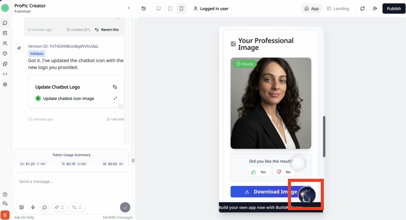 “Add the chatbot icon in the bottom right corner of the app, using my attached circular logo for its appearance.”Here’s how you might visually communicate this to your builder when requesting: