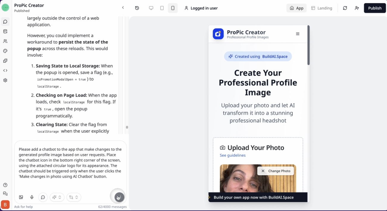 To make it easy, here’s a comprehensive message you can send to your app builder, combining all the key points:“Please add a chatbot to the app that can answer questions and make changes to the generated profile image based on user requests. Place the chatbot icon in the bottom right corner of the screen, using the attached circular logo for its appearance. The chatbot should be triggered only when the user clicks the ‘Make changes in photo using AI Chatbot’ button.”