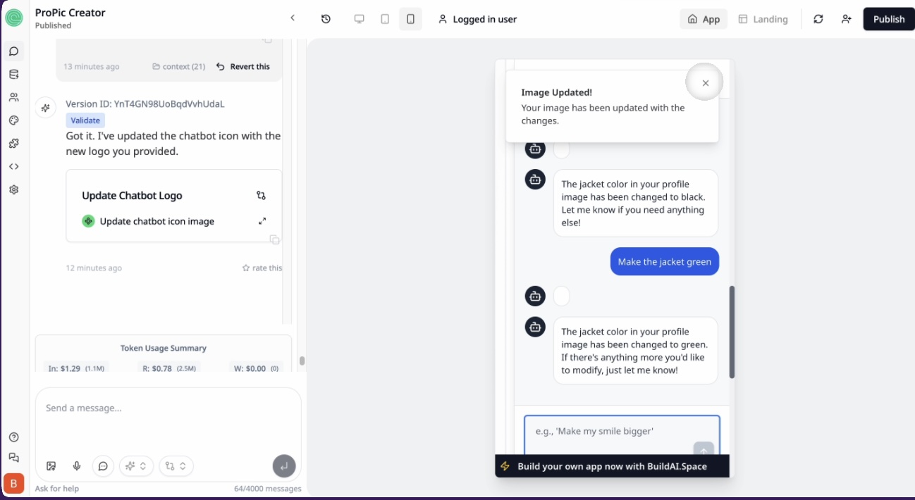 Once the chatbot is active, users can type specific instructions to modify their profile images or get help. Here’s an example conversation and the resulting image update: User requests a change through the chatbot interface:
