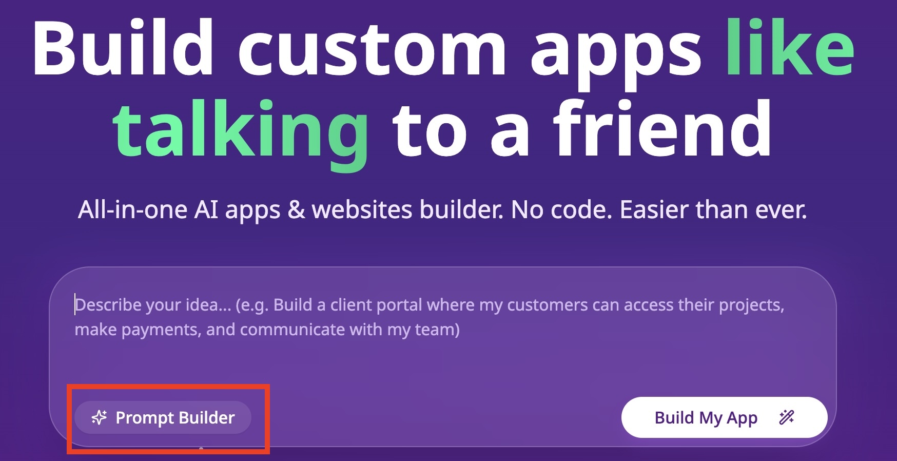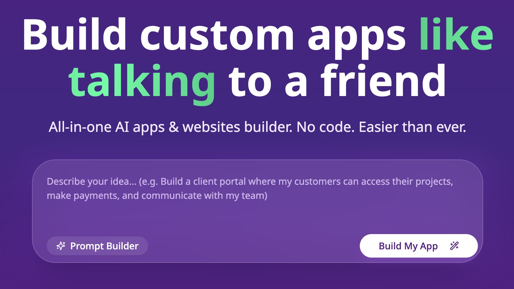 - Unsure how to phrase your idea? Use our Prompt Builder — it guides you with simple questions about your audience, key features, brand colors, language preferences, and other important details to help shape your app’s design and functionality.