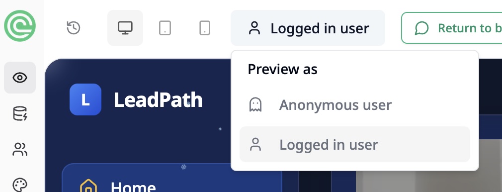 Your app is now ready to explore! The preview feature lets you test how it looks and behaves in real-time. Here’s how to make the most of it:- Switch between different user views (e.g., logged-in users or guests). This helps you verify that your app behaves correctly depending on whether a user is logged in or browsing anonymously.