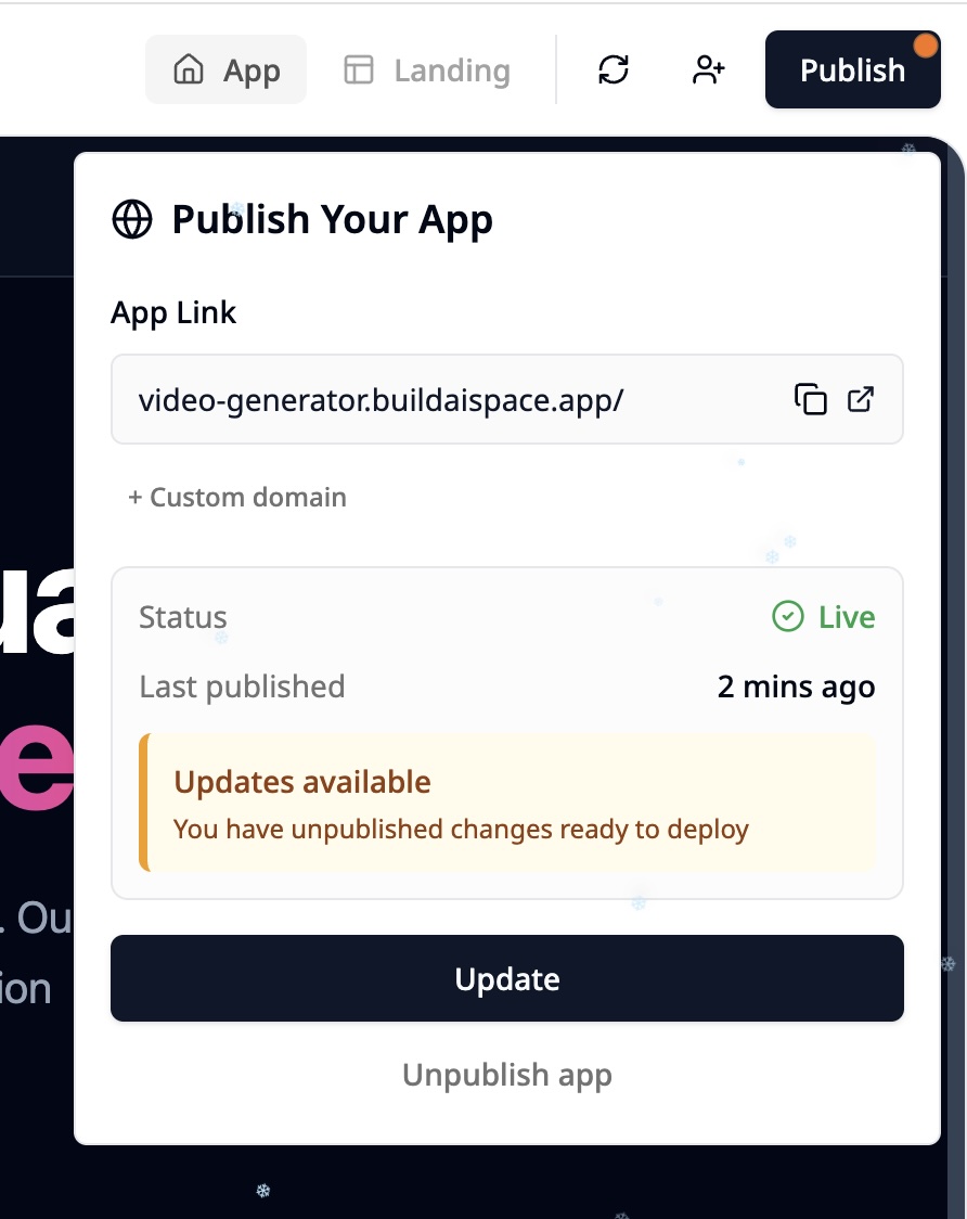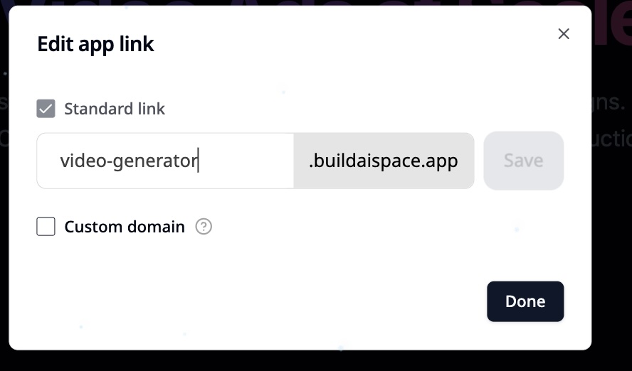 - Change your app’s subdomain under the buildaispace.app domain. For example, switch from: “mynewapp.buildaispace.app” to “video-generator.buildaispace.app”