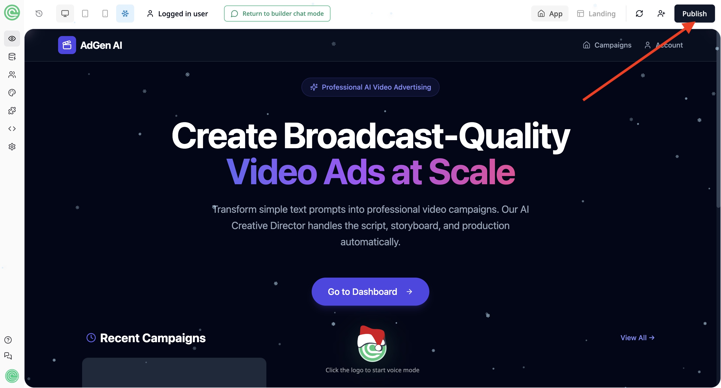 From your app dashboard, find the Publish button at the top right corner. This is your gateway to making your app available on the web. Click the Publish button to open the publishing options. Here, you’ll see your app’s default link, which typically looks like this: “your-app-name.buildaispace.app”